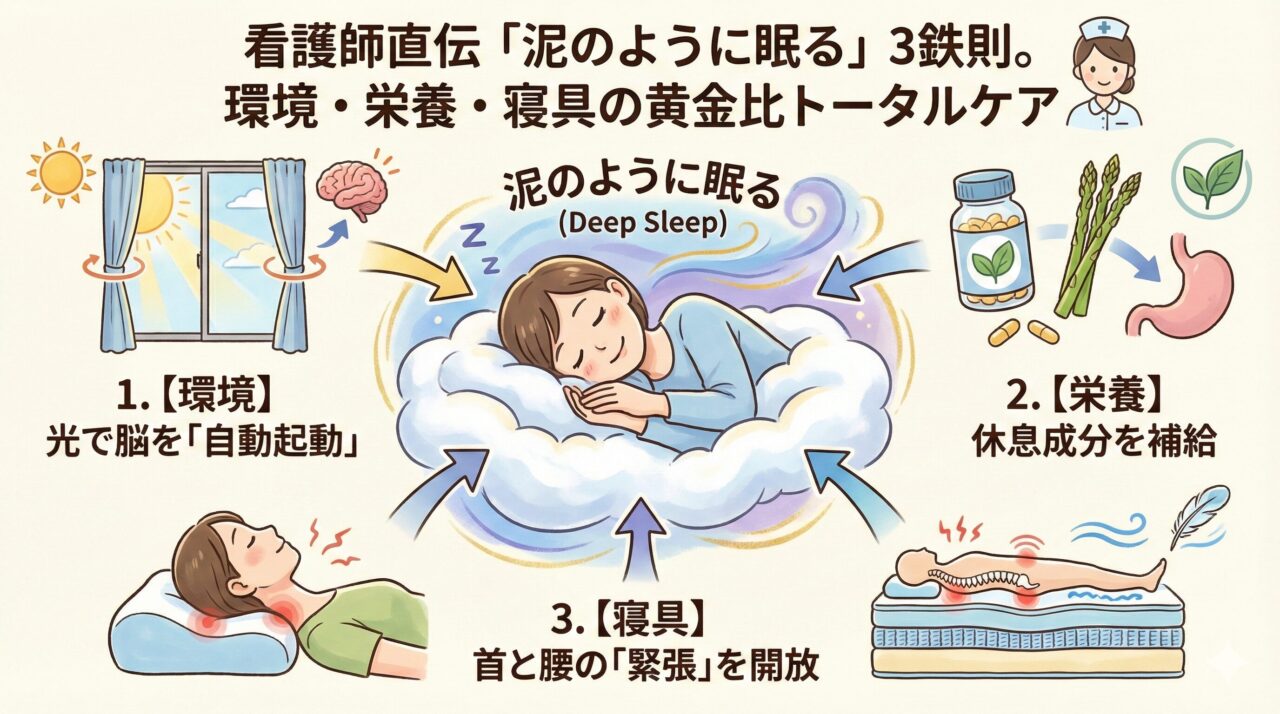 「健康診断で『腎臓の数値が悪い』と言われたけれど、自覚症状がなくてピンとこない」「親が腎臓病と診断された。透析にはなってほしくないけれど、食事は何を作ればい...看護師直伝「泥のように眠る」3鉄則。環境・栄養・寝具の黄金比トータルケア