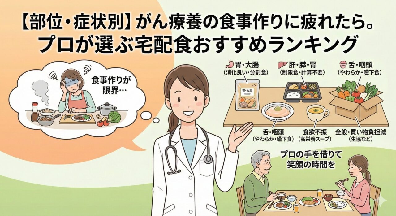 「ひと口だけでも食べてほしいのに、痛がって飲み込んでくれない…」 がんと闘うご家族を自宅で支えるあなたの毎日は、目に見えないプレッシャーと、「どうすれば食べて...【部位・症状別】がん療養の食事作りに疲れたら。プロが選ぶ宅配食おすすめランキング