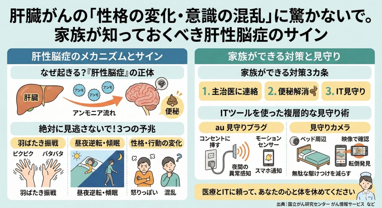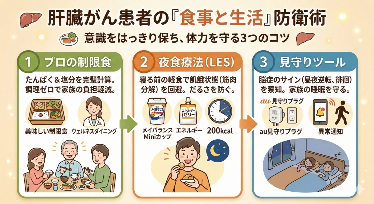 「いつも穏やかな親が、些細なことで急に怒鳴り出した」「昼間はずっと寝ているのに、夜中になると家中をウロウロと歩き回っている……」 肝臓がんの療養中、ご本人にこの...食べすぎも厳禁?肝臓がん患者の「塩分・たんぱく質」管理と、意識をはっきり保つ食事のコツ
