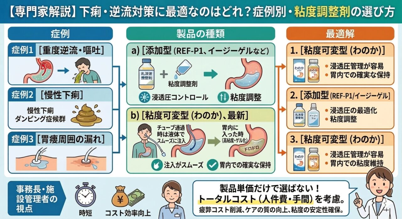 「この製品、栄養剤の前にいれるんだっけ?後にいれるんだっけ?」「フラッシュの水って、何mlが正解?」忙しい業務の中で、経管栄養の製品が変わるたびに手順を確認す...【専門家解説】下痢・逆流対策に最適なのはどれ?症例別・粘度調整剤の選び方