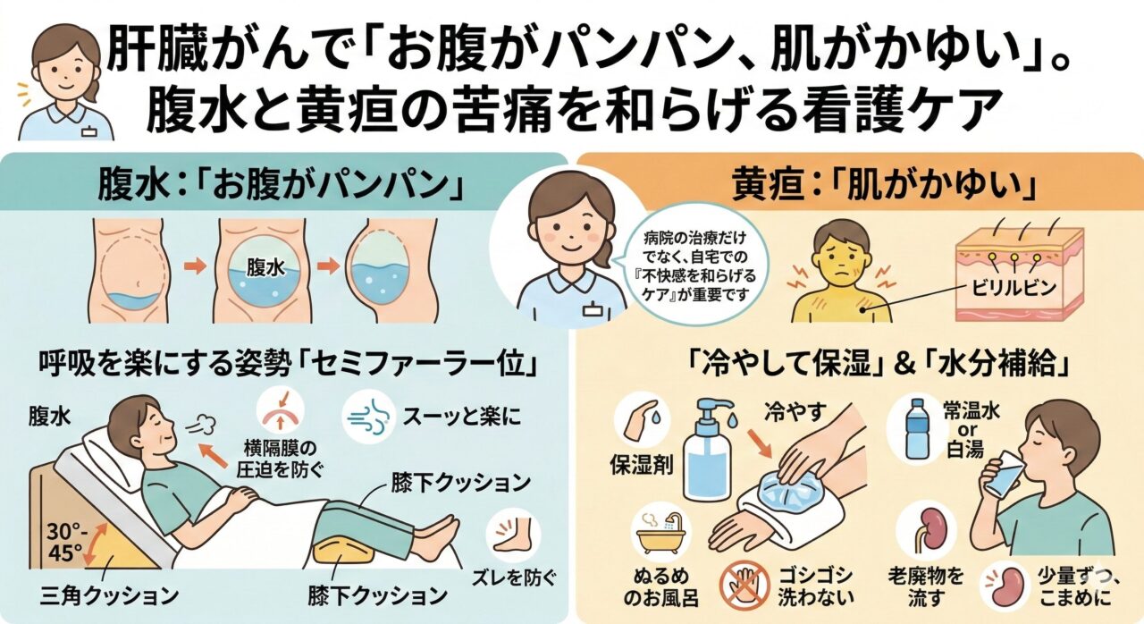 肝臓がんの末期を自宅で過ごすこと。 それはご本人にとって一番安心できる選択であると同時に、ご家族にとっては「急に状態が悪くなったらどうしよう」という不安との闘...肝臓がんで「お腹がパンパン、肌がかゆい」。腹水と黄疸の苦痛を和らげる看護ケア