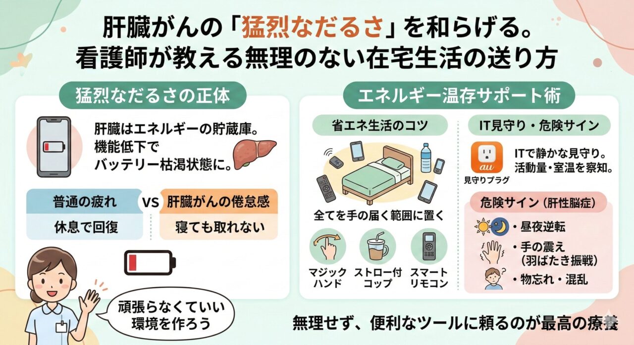 「肝臓にいいものを食べさせたいけれど、たんぱく質を摂りすぎると意識が混乱すると聞いて、毎日の献立作りが怖くなった……」「塩分を控えたら食事が美味しくないと言わ...肝臓がんの「猛烈なだるさ」を和らげる。看護師が教える無理のない在宅生活の送り方