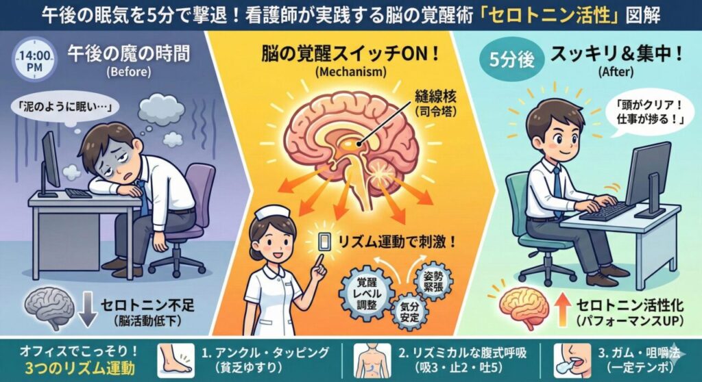 午後の眠気を5分で撃退!看護師が実践する脳の覚醒スイッチ「セロトニン活性術」