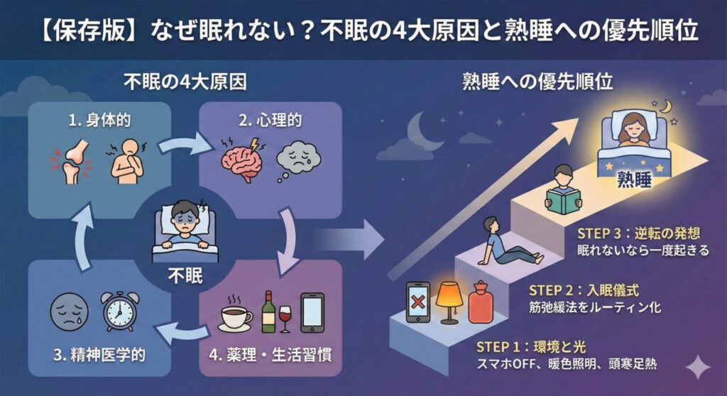 【保存版】なぜ眠れない?不眠の4大原因と「今すぐ試せる」熟睡への優先順位