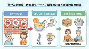 抗がん剤治療中で「味がしない」「口内炎が痛くて食べられない」と嘆くご家族には、口内炎や味覚障害でもスッと食べられる優しい食事の選び方も参考にしてください。