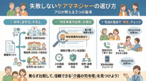もし担当のケアマネジャーが徘徊対策や制度に詳しくないと感じるなら、今後のために「失敗しないケアマネジャーの選び方」を確認しておくと安心です。