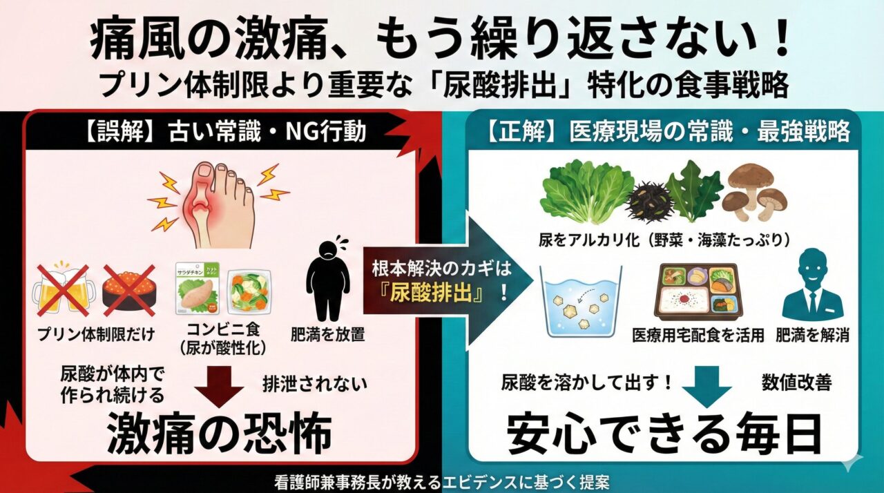 この記事では、忙しい働き盛りの男性が、面倒な自炊やカロリー計算を一切せずに尿酸値をコントロールするための「最強の食事戦略」を、医療的な根拠(エビデンス)に基づいて提案します。