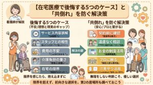 | 訪問看護 | 看護師が自宅を訪問し、健康状態の観察、医療的ケア(点滴や胃ろう管理など)を行う。 | 持病がある方、末期がんで自宅での看取りを希望される方。 |