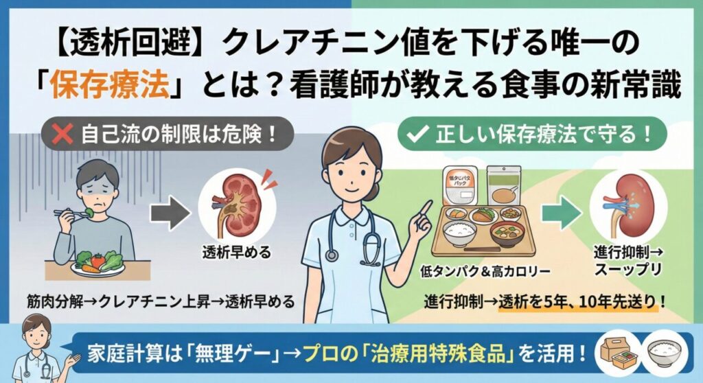 今の努力を無駄にせず、クレアチニン値を下げて透析導入を1日でも遠ざけるための「保存療法の新常識」を今すぐ確認して、大切な腎臓を守り抜いてください。