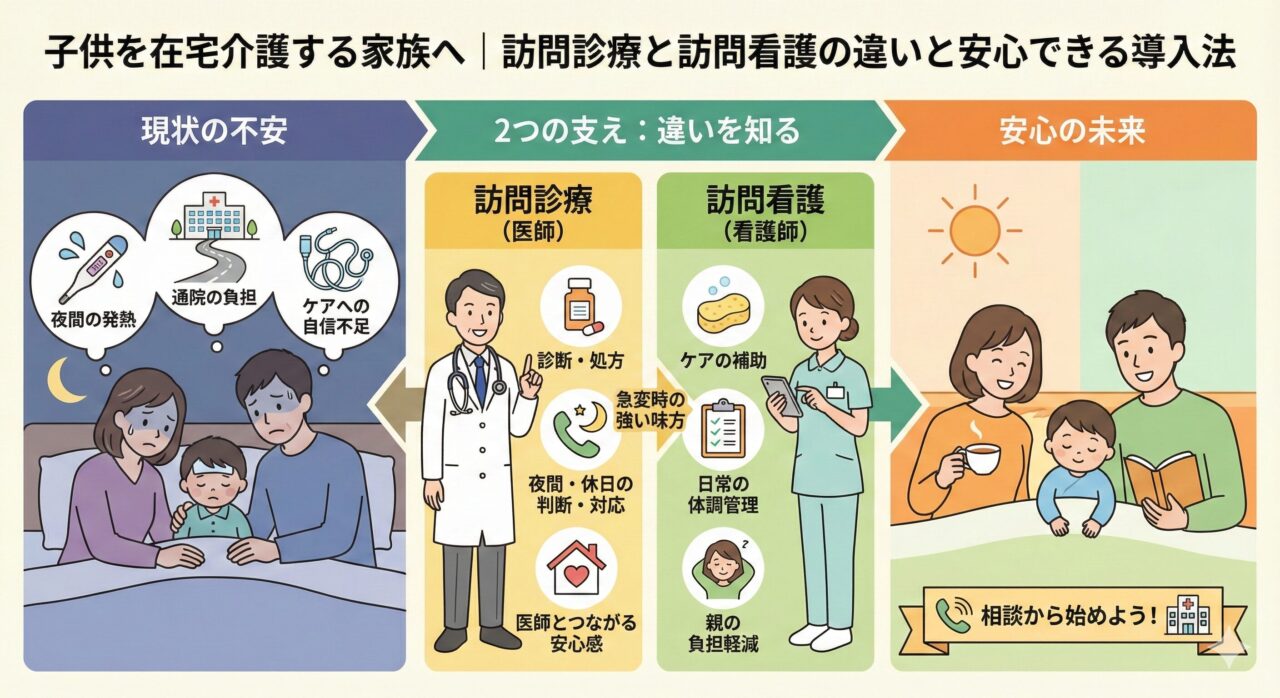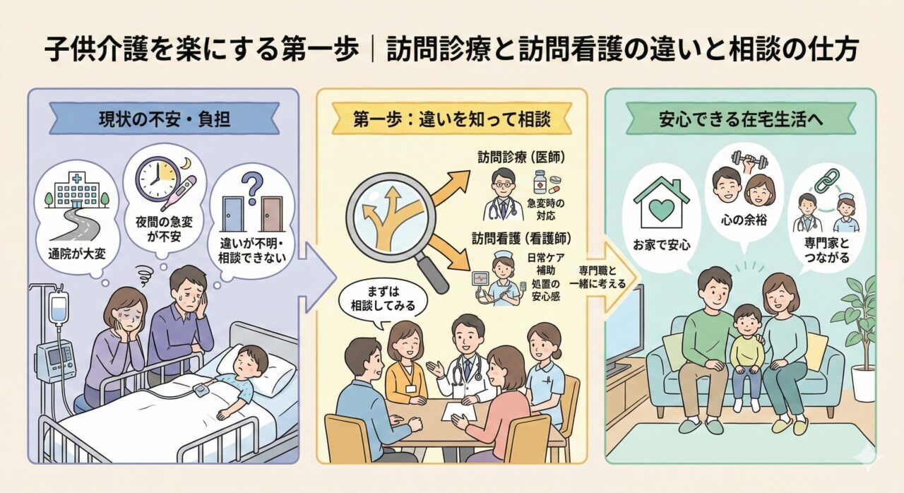 「訪問診療や訪問看護を使った方がいいのかな」と思っていても、実際にどう相談して始めればいいのか分からない——そんな不安を抱えるご家族は少なくありません。 特に子... -