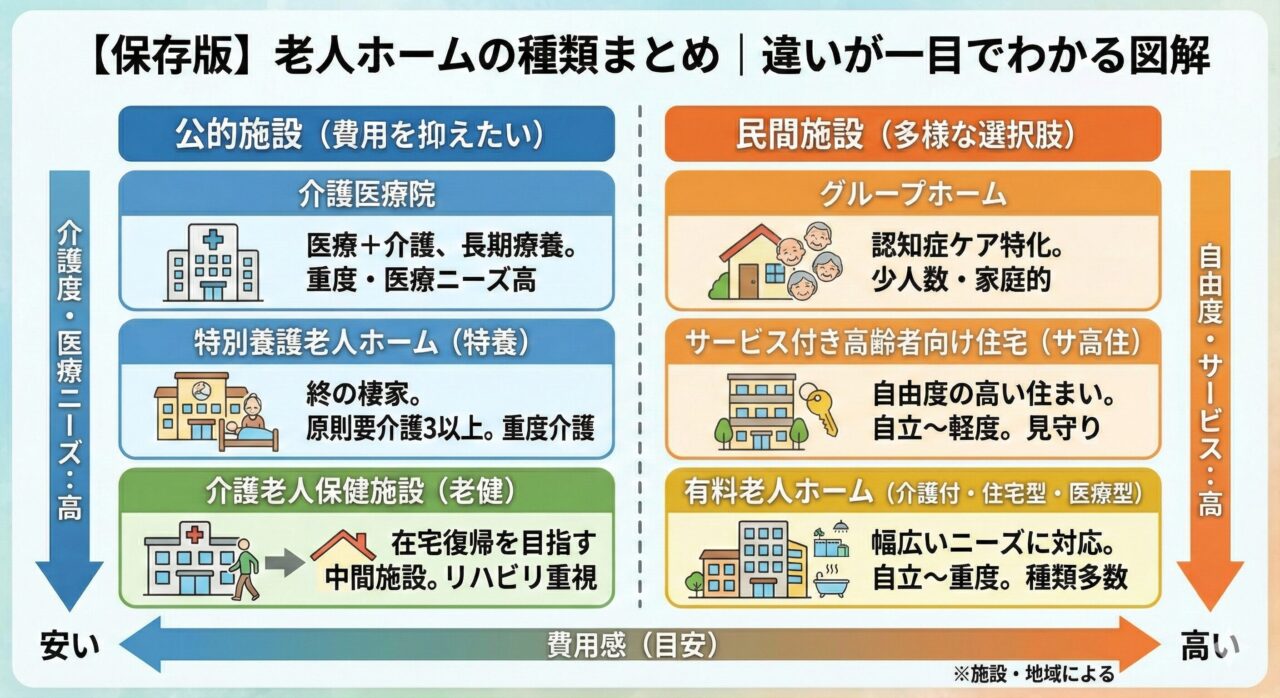 【保存版】老人ホームの種類まとめ|特養・老健・有料・サ高住・グループホーム・介護医療院の違い