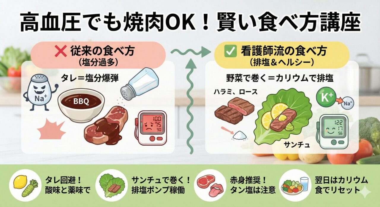 高血圧でも焼肉はOK?血圧を上げないタレ回避術と野菜の排塩効果